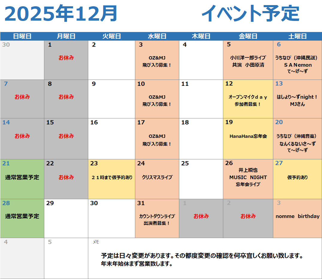 2025年11月予定 日々更新しています。 2025 10/24 お知らせ お知らせ よかったらシェアしてね! URLをコピーしました! 2025.10.25(土)蘭さくら&もこライブ さくらさん体調不良につき中止<(_ _)> トランペット演奏、MJ&Kiyoshi 2025.10.29(水)井上瞬也 Music Night 飛び入りさんOK!